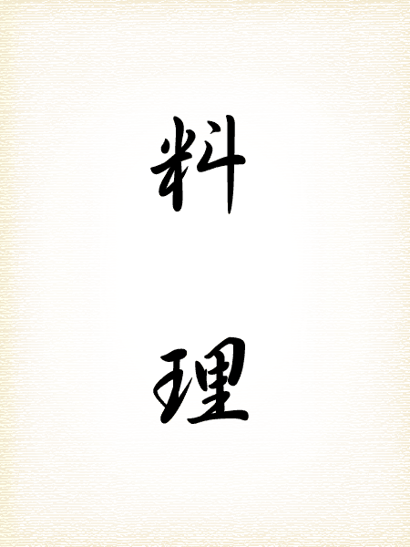 Kochen heißt auf Japanisch „Ryo-Ri“ – dafür stehen die zwei japanischen Zeichen rechts und bedeuten wörtlich „der Logik (in der Natur) folgen“ bzw. „Ausgewogenheit (zwischen Mensch und Natur) suchen“.